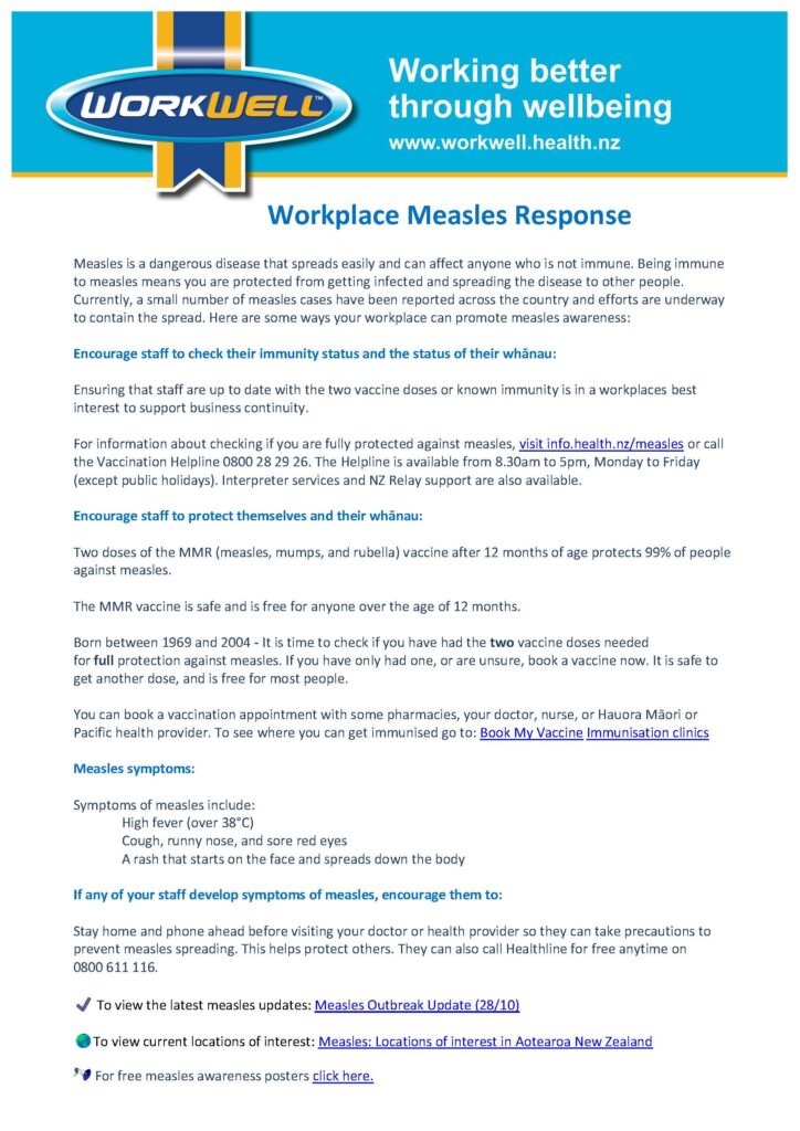There have been recent cases of measles in Aotearoa New Zealand. In order to raise workplace awareness about this illness, below is a Workplace Measles Awareness flyer produced by WorkWell.