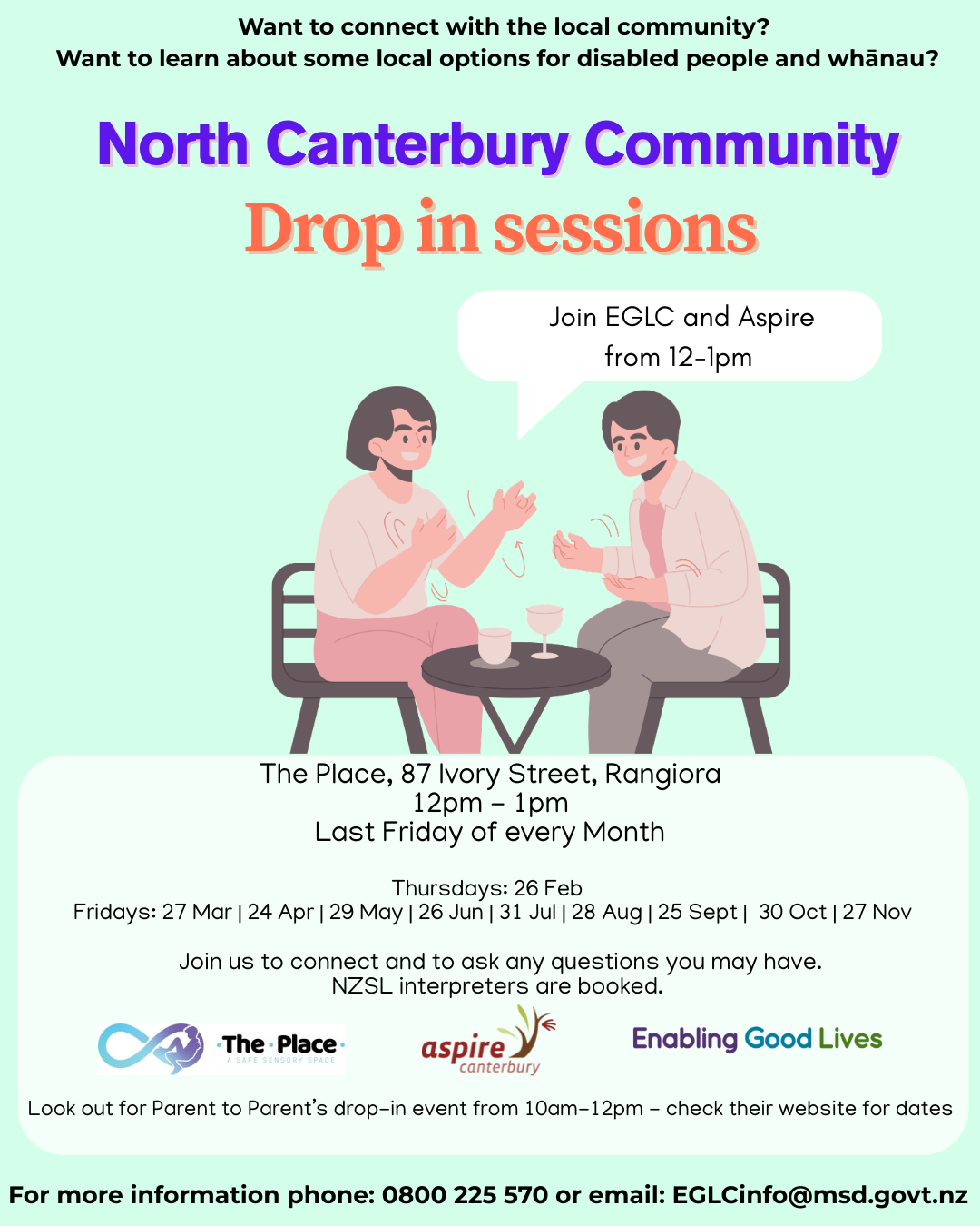 This is a chance for anybody to come along and ask questions or find out more about what Enabling Good Lives Christchurch are doing. Some of our friendly team will be at each session to answer your queries.